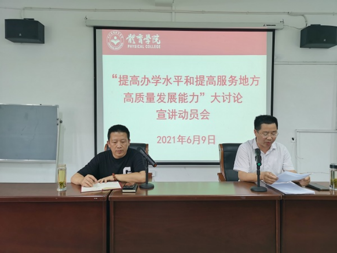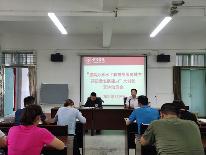 为了统一思想、凝心聚力,推进学校“十四五”规划实施,提高学校办学水平,,更好地服务地方高质量发展。6月9日下午,永利yl23411集团在向学楼301会议室举办“提高办学水平和提高服务地方高质量发展能力"大讨论宣讲动员会。学院领导、科室负责人、全体教职工参加了会议,会议由院党委书记付和忠主持。