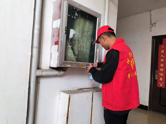 活动中,大学生志愿者在社区工作人员的带领下,来到社区居民小区,用抹布、铲刀、墙刷、扫把等工具,认真仔细的清除墙面、门柱、立杆、垃圾桶、护栏上的各类违法小广告,以实际行动助力九江市文明城市创建。