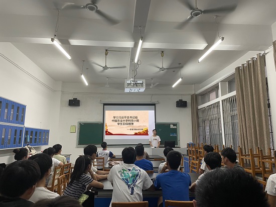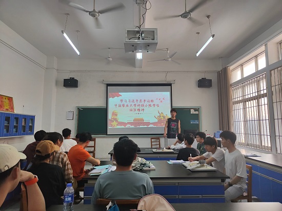 学生会主席眭元海讲到,习近平总书记的谆谆教诲和殷切希望让我无比振奋,我们要牢记习近平总书记的深情嘱托,敢于“自找苦吃”,敢于挑战自我,勇担时代使命,将课堂学习与社会实践结合,让青春之花绽放在祖国大地上。