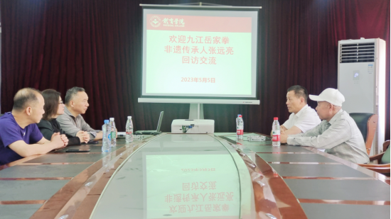 交流会主要就九江岳家拳的挖掘整理、传承保护、九江岳家拳非遗传承与爱国主义教育基地的建设以及校企合作等相关事宜进行探讨。