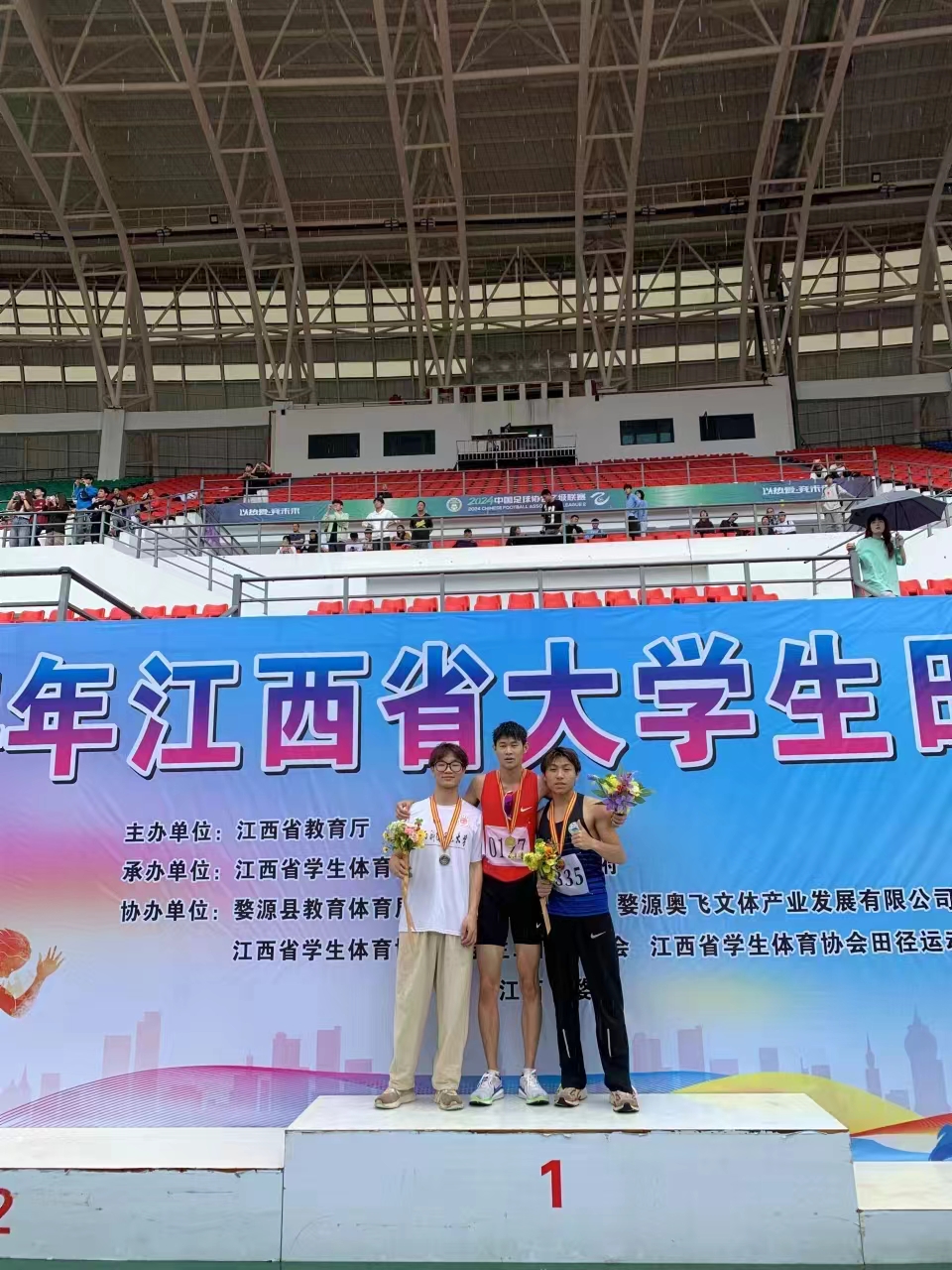 2024年6月28日,为期一周的江西省大学生田径锦标赛在婺源体育中心落下帷幕,我校派出了由18名运动员和2名教练员组成的20人代表队参加了此次比赛。由于天气原因,此次比赛几乎全程在大雨中进行,我校运动健儿们不畏艰辛,不仅在场上展现了昂扬向上的运动风采,更彰显了积极进取和团结奋进的体育精神。建工学院林文震同学在瓢泼大雨中,以1.85米的成绩夺得了男子甲组跳高比赛银牌,同时获得男子甲组跳远第五名。建工学院的杨振乾同学以52.98秒的成绩夺得了男子甲组400米铜牌,曹锦辉同学在100米比赛中以10秒87获得乙组第三名,朱清涛同学获得男子乙组跳远第八名。