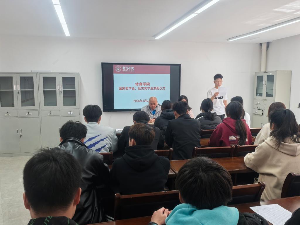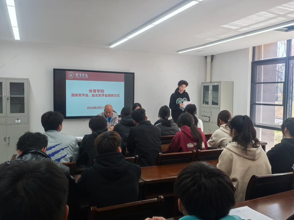 随后,国家奖学金获得者文彬同学上台发言。发言中,他分享了自己在训练场上挥洒汗水、在课堂中刻苦学习的日子。无数次想要放弃,但心中对体育的热爱和对知识的渴望让他又坚持了下来。