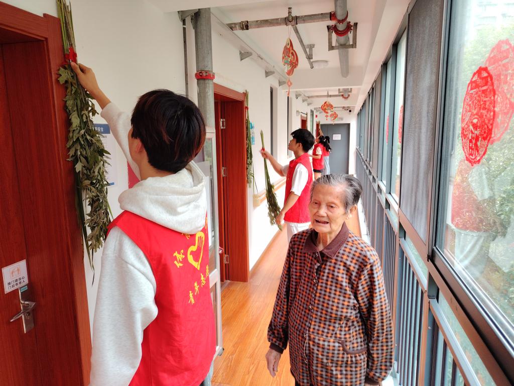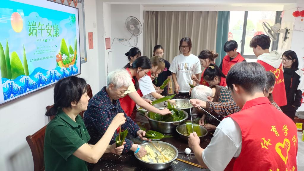 在养老院活动现场,同学们精心布置,悬挂五彩香囊、张贴端午主题装饰,让院内洋溢着浓厚的节日氛围。同学们提前准备了糯米、粽叶、红枣等食材,老人们耐心地向年轻人传授包粽子的技巧,折粽叶、填糯米、扎丝线,一折一绕间,传递着代代相传的节日习俗。