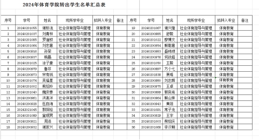 根据《yL23411永利集团学生转专业管理办法(试行)》九院字【2024】111号文件的规定,经过学生本人申请,且申请转出人数符合学校的规定,拟批准2024级社会体育指导与管理专业的36名学生转出申请,公示名单如下: