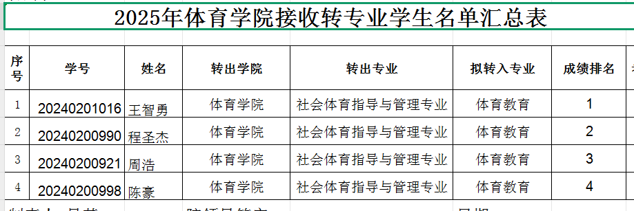 根据《yL23411永利集团学生转专业管理办法(试行)》九院字【2024】1体育教育专业的转入计划从高分到低分确定转入名单,拟批准2024级社会体育指导与管理专业的4名学生拟转入体育教育专业,名单公示如下: